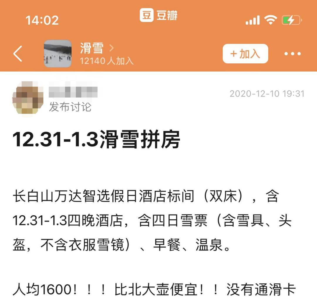 “16~17号武汉出发去神农架滑雪拼团的有吗?我一个人,报团有房差”;“11月14~15长白山万达度假村滑雪拼团,已买了万达酒店的房券”;“长白山万达智选假日酒店标间(双床),含12.31~1.3四晚酒店,含四日雪票,人均1600元”……