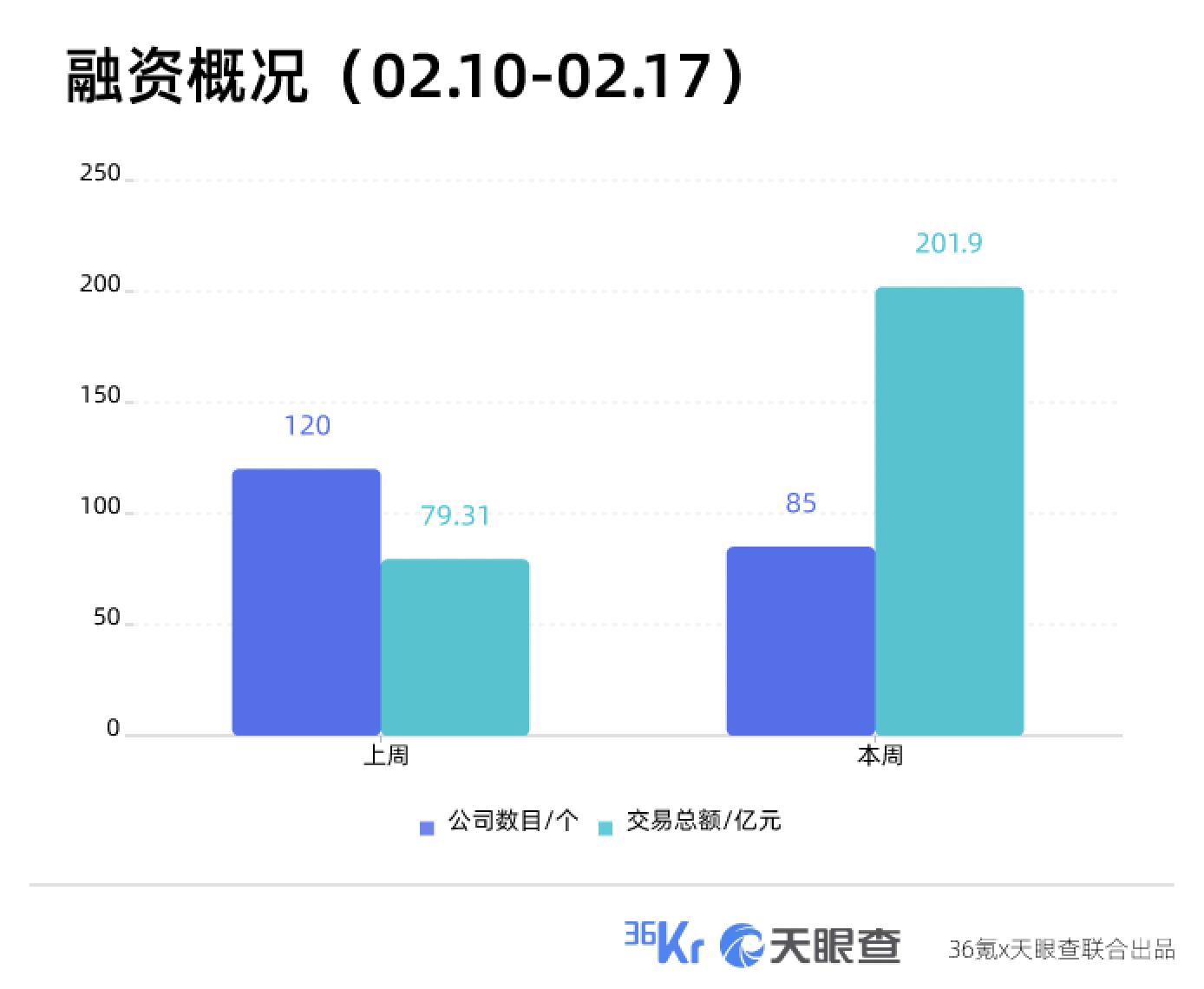 本周(02.10~02.17)国内共发生85起融资事件,较上周120起同比减少29.2%;近一周交易总额超201.9亿人民币,较上周79.31亿人民币同比增加154.57%。