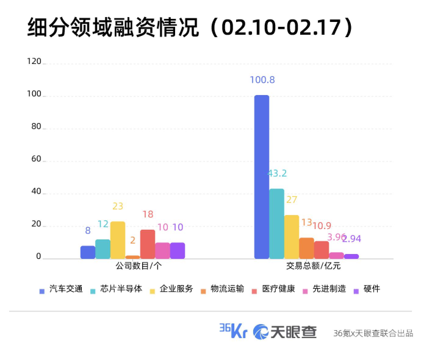 本周融资主要分布在企业服务,医疗健康和芯片半导体领域;汽车交通领域披露的交易总额金融领域最多,为100.8亿元。