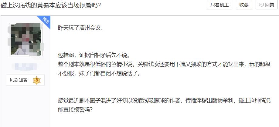 在剧本杀贴吧中,有一位网友就发帖询问:遇到没底线的黄暴本应该当场报警吗?该网友恰好就是玩了小雷上面提到的《清州会议》,表示整个剧本就是一个低俗x情小说,关键线索还要用下流猥琐的方式找出来,玩得十分不舒服,同行不知情的妹子直接自闭不想说话。