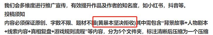 此外,在征集、收购剧本的相关帖子中,基本都会有“黄暴本坚决拒收”等声明,而且不少网友都在自发的抵制黄暴本,表示如果看到了,建议直接举报,还剧本杀市场一个清净。