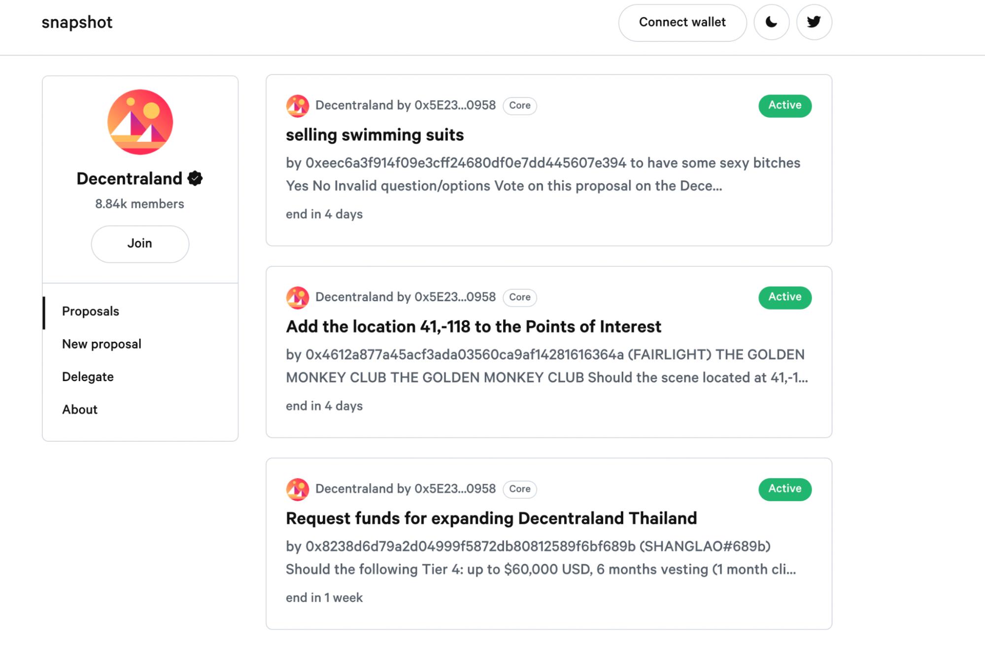 尽管现在还处在早期阶段,但Decentraland的社区对这次转变似乎是买账的。项目的快照页面显示,目前Decentraland有 8840 名会员,超过了Yearn、Polygon、The Graph 与 Compound等热门项目。截至本文撰写时,有有 50 多项提案处于活跃状态,所涉事务既有重大决策,也有鸡毛蒜皮。