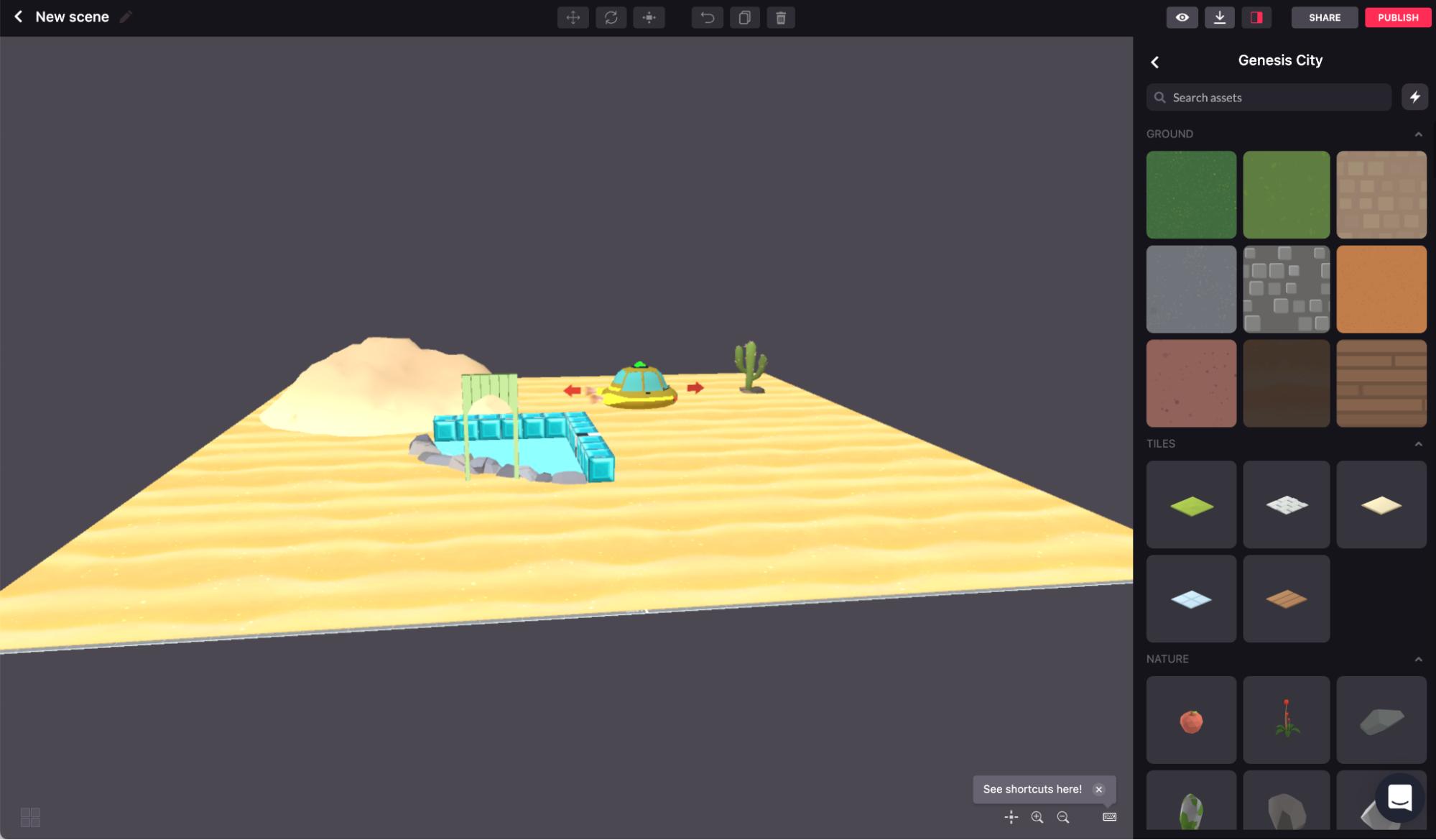 要想创建新场景,用户必须去到生成器。用户可以在上面上传藏品、注册唯一名称或设计场景。我发现这个生成器很有趣,而且也很容易上手,虽然我做出来的东西毫无创造性或品味可言。 (沙地、水池、门口。 出租车? 仙人掌!)我要是有块土地的话,我肯定会玩得开心一些,起码放上去的东西不至于那么糟糕。