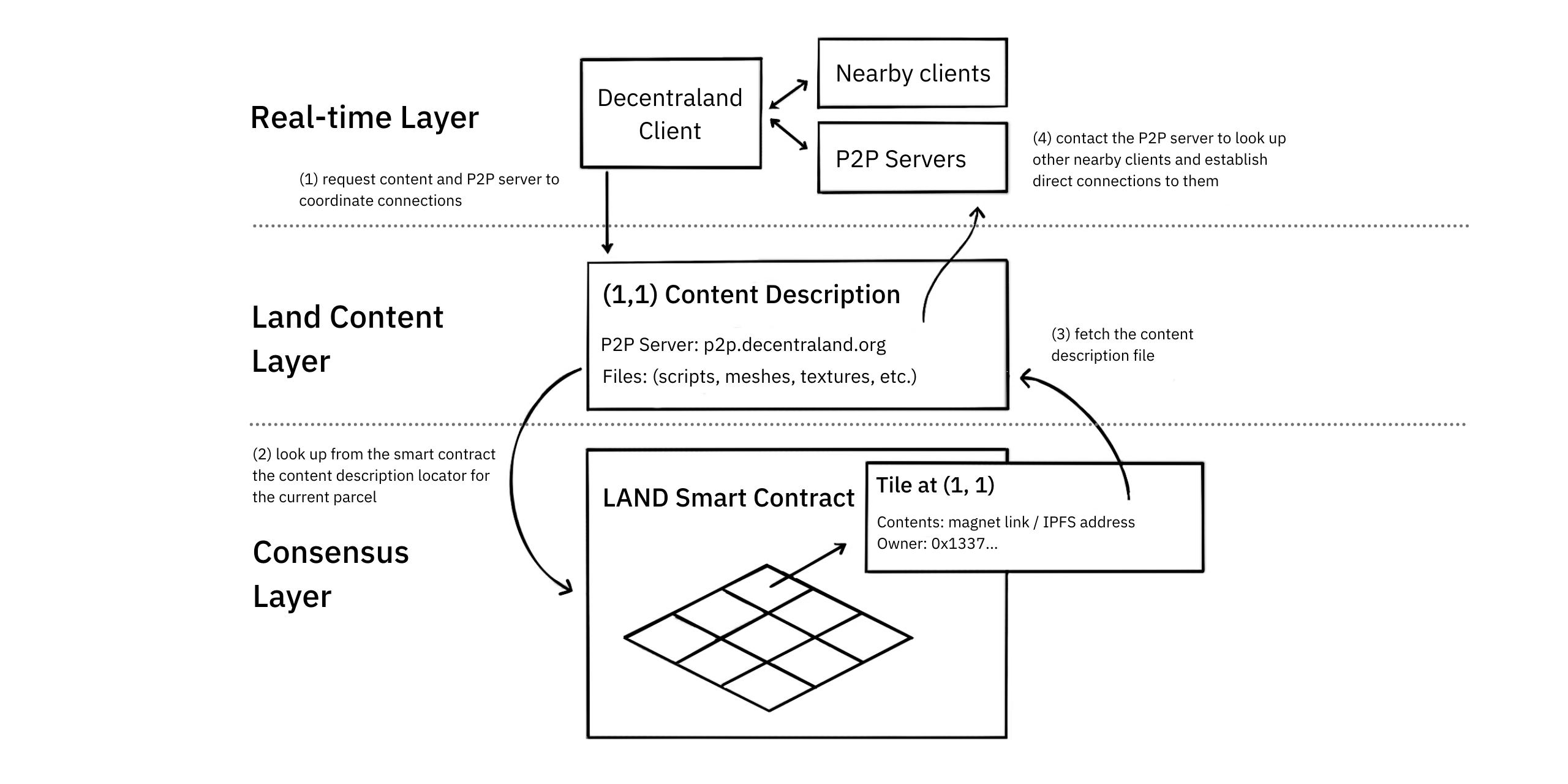 土地内容层(Land content layer)。一个去中心化的存储系统,负责分发住在这个虚拟世界里面的内容。内容包括文本、音频、视觉信息和更复杂的东西,如动画。