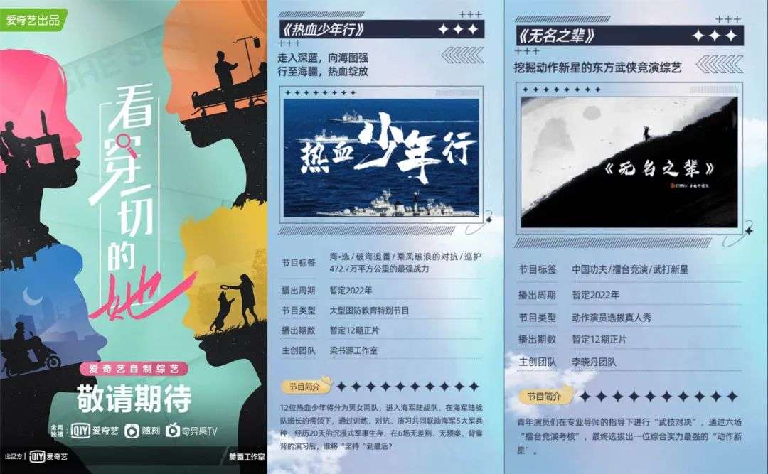 除了常规音乐、探案、婚恋节目之外,芒果TV探索布局了注重国防教育推广的《热血少年行》,关注成功职业女性再就业的《致富女人》,为动作演员提供东方武侠竞演舞台的《无名之辈》。