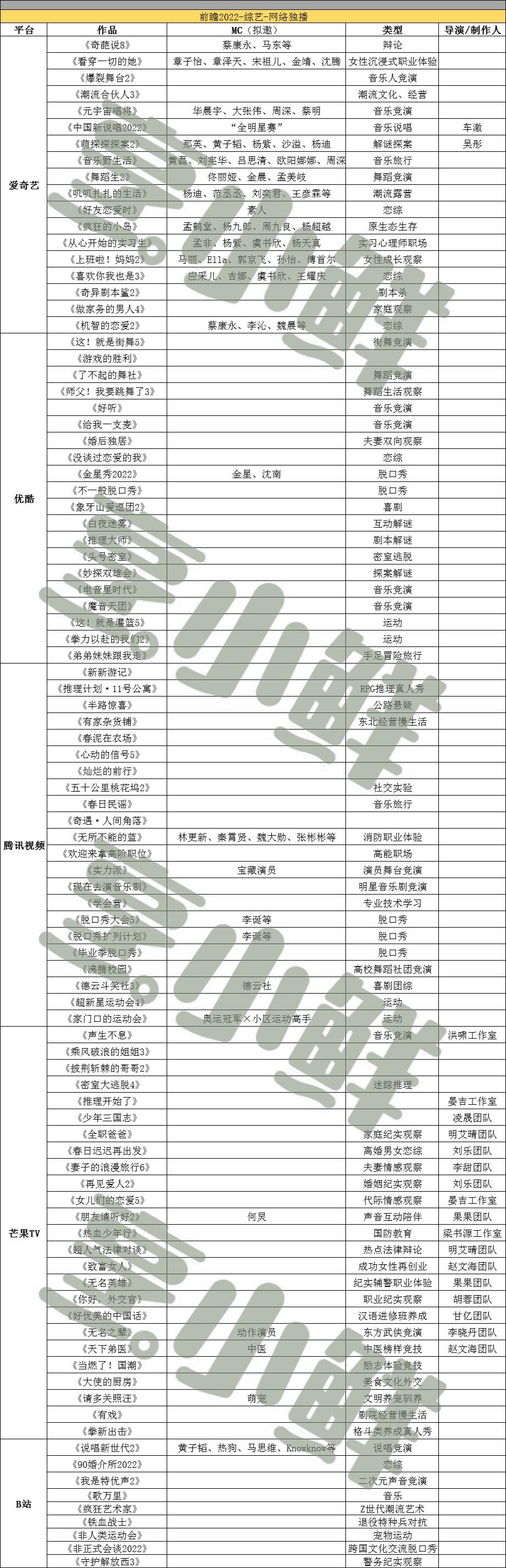据不完全统计,爱优腾芒B五大平台( 排名不分先后 )共释出94档待播网络综艺,其中包括8部恋综、16部音乐类综艺、8部脱口秀、16部职业体验/观察、10部解谜探案类节目。