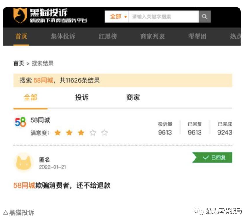 除此之外,在黑猫投诉平台上,关于58同城的投诉量高达9613条,其中涉及的内容也是五花八门,包括租房争议、维修被骗、求职收费、虚假招聘、客服不作为、VIP扣费等,满意度仅为三星。