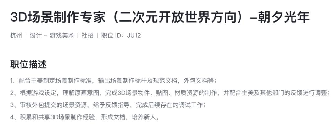 Tech星球了解到,字节在近期开始对这类开放世界的二次元游戏招兵买马,在字节跳动的官网可以看到,旗下的游戏品牌“朝夕光年”招聘关于二次元开放世界方向的游戏职位有12个,职位涉及3D场景制作、二次元ACT战斗、角色扮演等。