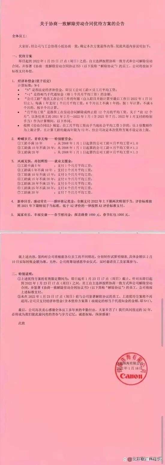 具体来说,佳能此次补偿方案,包括经济补偿金、特别慰劳金、就业支援金、感怀铭记奖金以及春节慰问金等五大部分组成。其中,人们最熟悉经济补偿金“N+1”模式,佳能不设补偿上限。