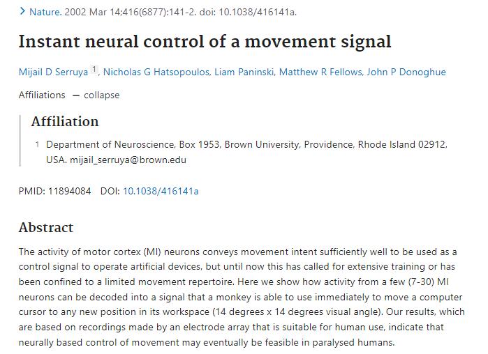 事实上,早在 2002 年 3 月,来自布朗大学的神经学家们就已经能够成功地让猴子在电脑屏幕上移动光标了。和 Neuralink 的实验一样,他们也使用了植入电极来解码猴子运动皮层中几十个神经元的活动,但在时间上却比 Neuralink 早了将近 20 年。