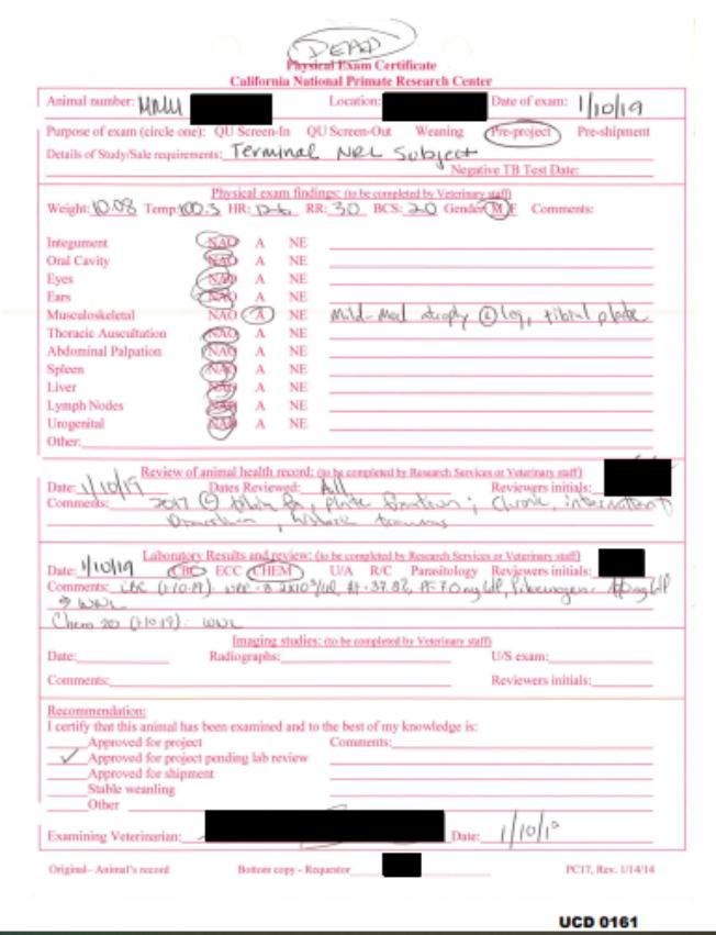 图 | 某只猴子的尸检报告,上面写着 DEAD(来源:PCRM)