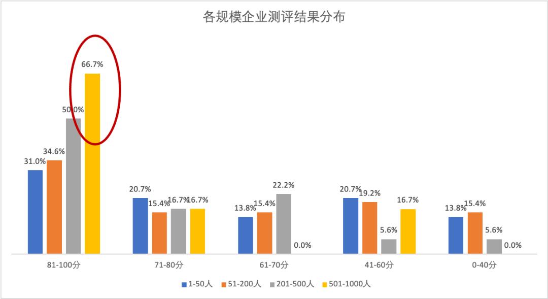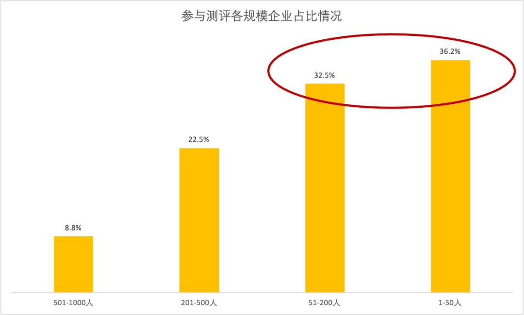 本次测评默认200人以下人员规模的为中小企业,参与测评的企业中,1-50人规模的企业占比36.2%,51-200人规模的企业占比32.5%,中小企业占整体调研企业的68.7%。