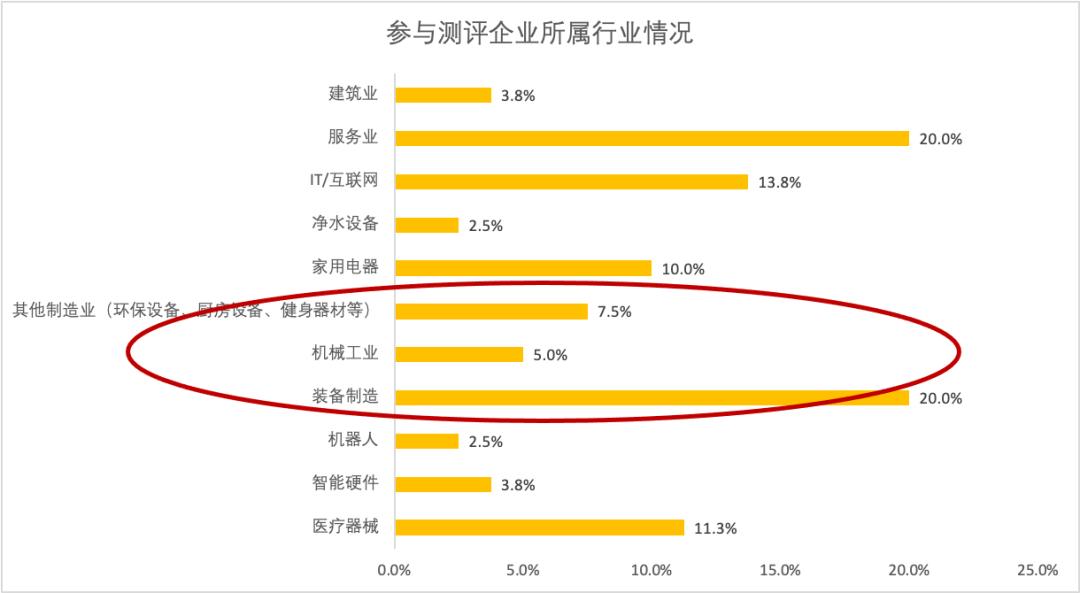 本次测评中,装备制造、其他制造业及器械工业这三类传统制造业企业数量占整体调研企业的32.5%;服务业紧随其后,占测评总比的20%。