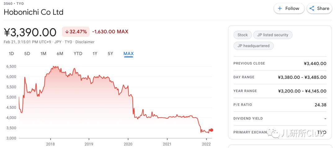公司在2015年在东京交易所,以5,020日元的发行价格上市。在手帐热的2018年,Hobonichi股价一度上涨至6,500日元。由于疫情影响,产品发售活动大规模中止,直营店铺停业,销售额受到影响,自发售以来2020年首次出现销售数量同比下降情况。同时,股价一路下跌,目前维持在每股3390日元。