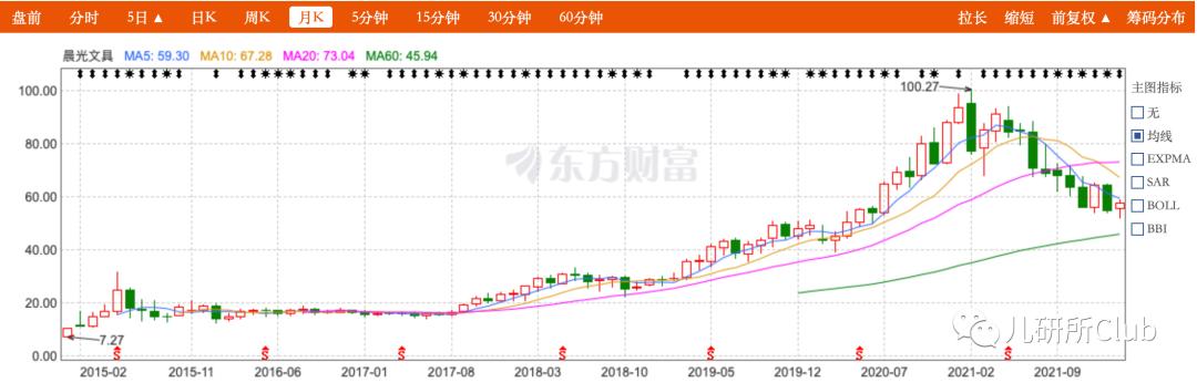 虽然晨光市值相较2021年最高点缩水40%,但是相比于2015年13.15元/股的发行价格,晨光股价一路高歌,市值翻倍超400%。