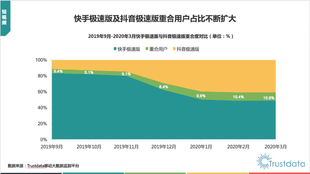 同时,快手极速版与抖音极速版的用户也在不断重合。移动大数据监测平台Trustdata报告数据显示,两者用户重合度已从2019年9月的5.4%,上升到2020年3月的10.9%——其背后,正是抖音极速版对快手极速版的不断蚕食。有报道称,抖音极速版、火山版如今在东北三省用户偏好度尤为显著,在快手大本营渗透率越来越高。