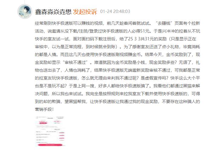 “经常刷到快手极速版可以赚钱视频,说邀请从没下载/注册/登录过快手极速版的人必得51元。于是拉着从不玩快手的室友试一试,面对面扫码下载注册后,给了共31元的奖励(显示在审核中)。此后几天也使用快手极速版刷视频赚金币。结果金币奖励到了,现金奖励却显示‘审核不通过’。上网一搜,好多人都是类似情况。”1月24日,用户“鑫森淼焱垚懋”就投诉称。截至发稿,尽管该用户多次补充投诉,但快手官方并未对上述投诉给出具体回复。