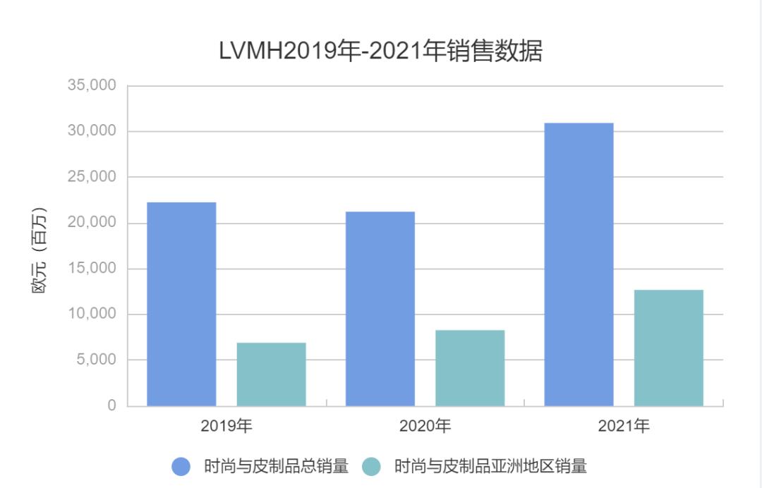 以中国为主的亚洲地区,对于皮包、时尚手链的偏爱尤为明显,财报中,LVMH2021年时尚与皮制品的收入较2020年同比增长47%,达89.64亿欧元。其中,亚洲地区占时尚与皮制品类别总收入的41%,较去年同比增长53.17%。