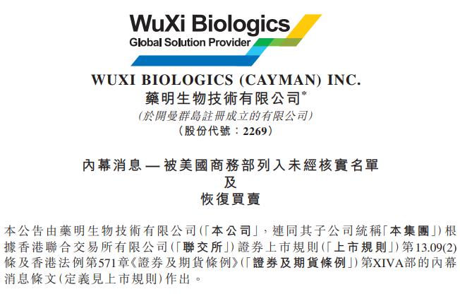 据药明生物官网声明,为全球客户提供的服务不会因两家公司被列入“未经核实名单”而受到影响,各项业务均正在稳步推进。