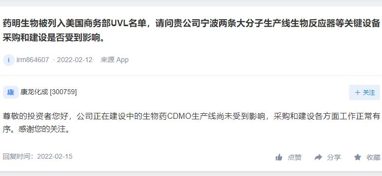 此外,国内另一家CDMO巨头康龙化成在互动平台回复投资者称,公司正在建设中的生物药CDMO生产线尚未受到(药明生物被列入美国商务部UVL名单)影响,采购和建设各方面工作正常有序。