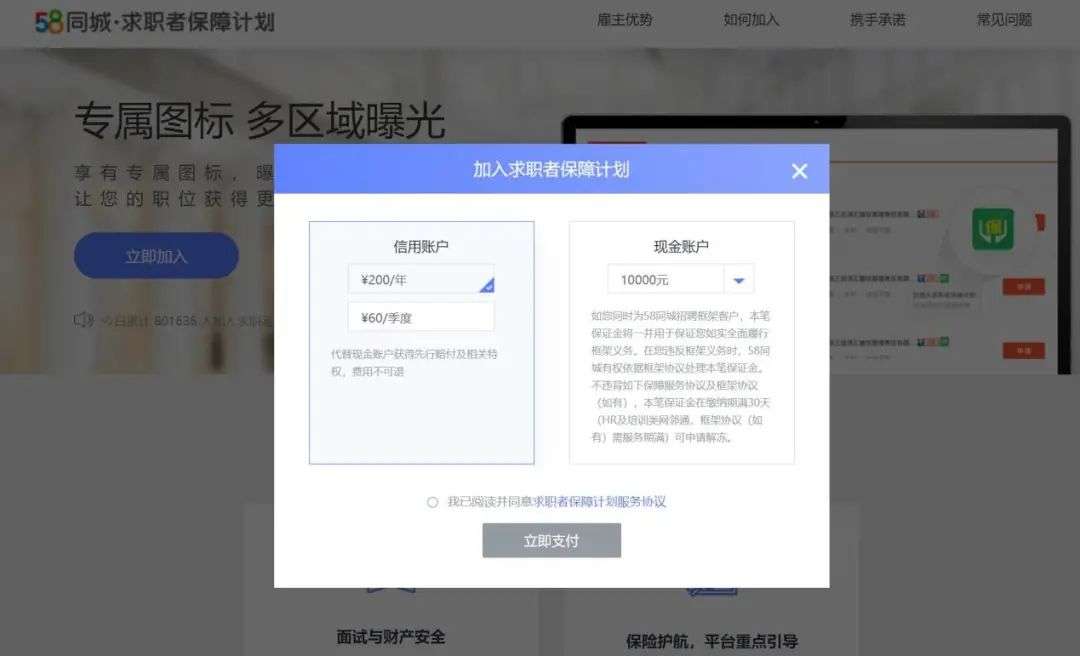 在58同城网站,新浪科技随意编造一个职位信息、地址信息和企业名称后,即可选择发布全职招聘信息。不过,在确认发布之前,58同城强制要求加入求职者保障计划。这个所谓的保障计划,其实就是缴纳保证金,如果采用现金账户,也只是需要缴纳10000元。