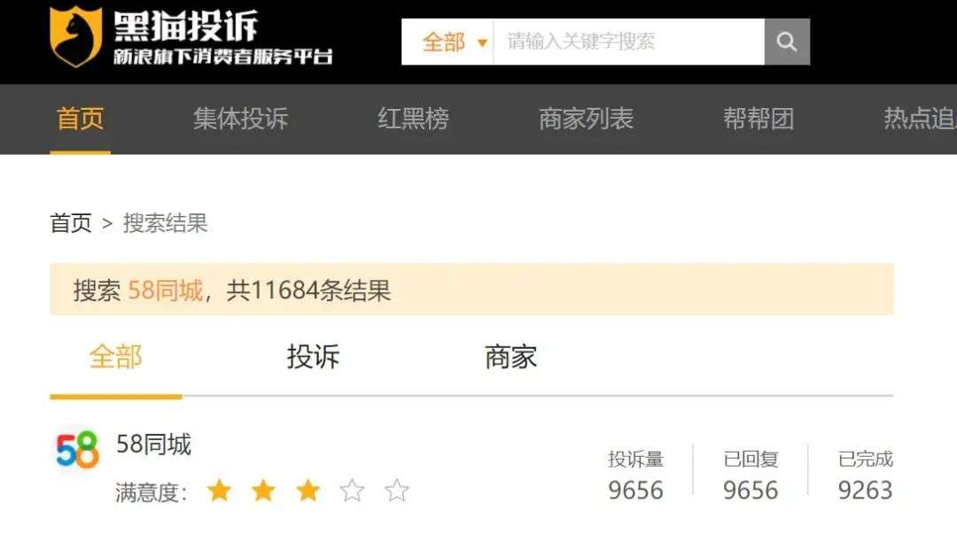截止2月21日,在黑猫上关于58同城的投诉达到了9656件,几乎每天都有新增的关于58同城的投诉,多集中在招聘受骗、使用家政服务被骗、款项被恶意侵吞等方面。