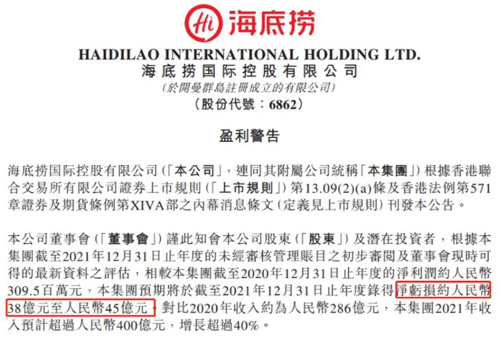 2月21日早间,海底捞发布盈利预警,称相较于2020年的3.09亿元净利润,2021年预计净亏损人民币38亿元至45亿元;与此同时,2021年营收预计超过人民币400亿元,对比2020年约286亿元的收入,增长超过40%。