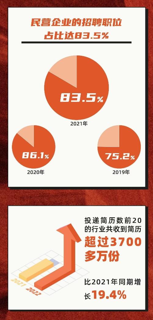 民营企业提供了超过83.5%的工作机会,2021年同期这一比例为86.1%,而疫情前的2019年同期这一比例为75.2%。与此同时,在春节后寻找新的工作机会的人群也大幅增加,简历投递量较去年同期增加19.4%。