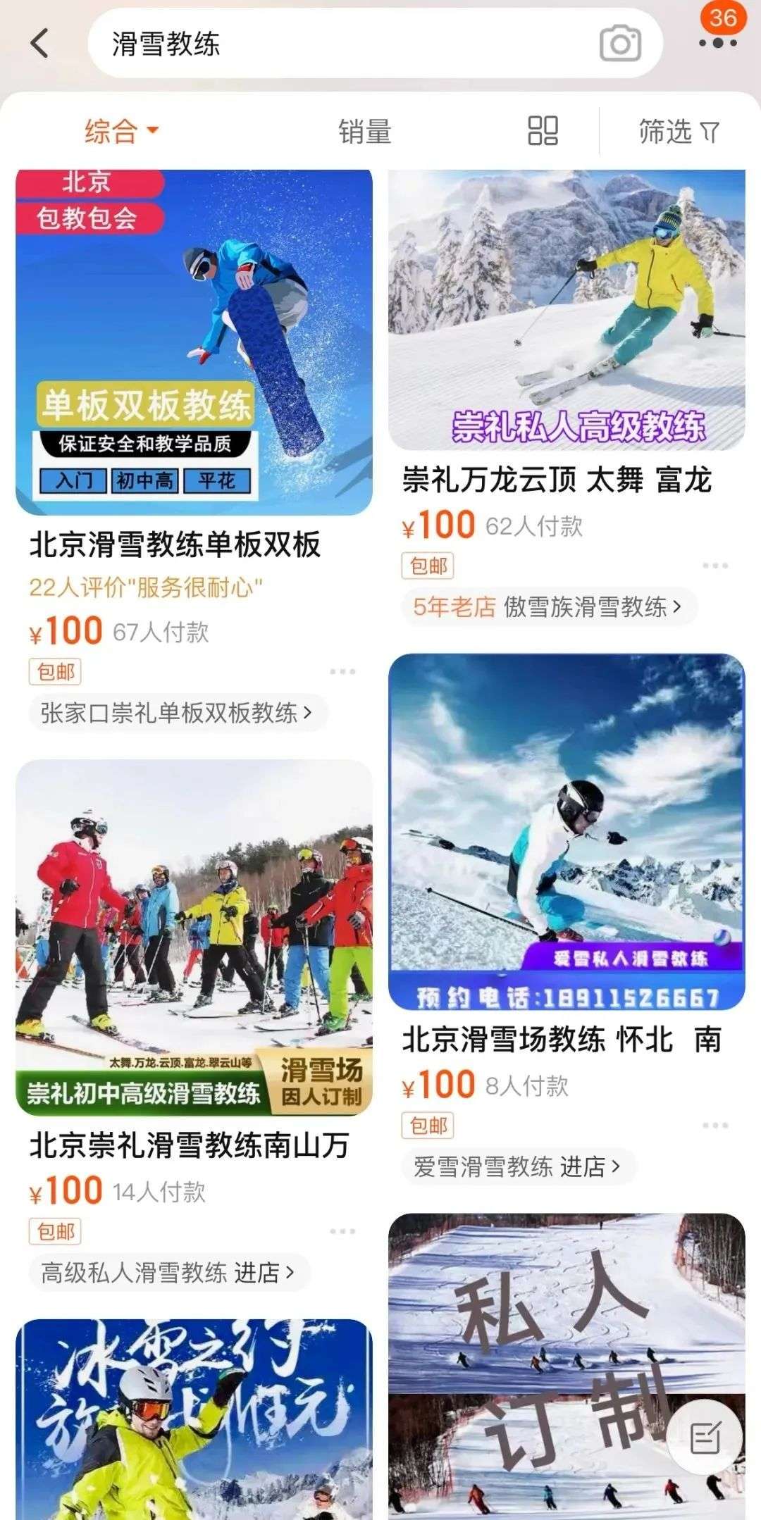 最近在淘宝搜索“滑雪教练”,会跳出不少链接,北京、吉林长白山、河北崇礼……国内各大滑雪圣地都有,价格都差不多。比如长白山景区,多为3小时起步,按教学时长、“一对一”或“一对多”的教学形式,收费各有不同。比如一对一教学3小时1000元、全天(9:00-16:00,吃饭半小时)价格1500元-1600元。