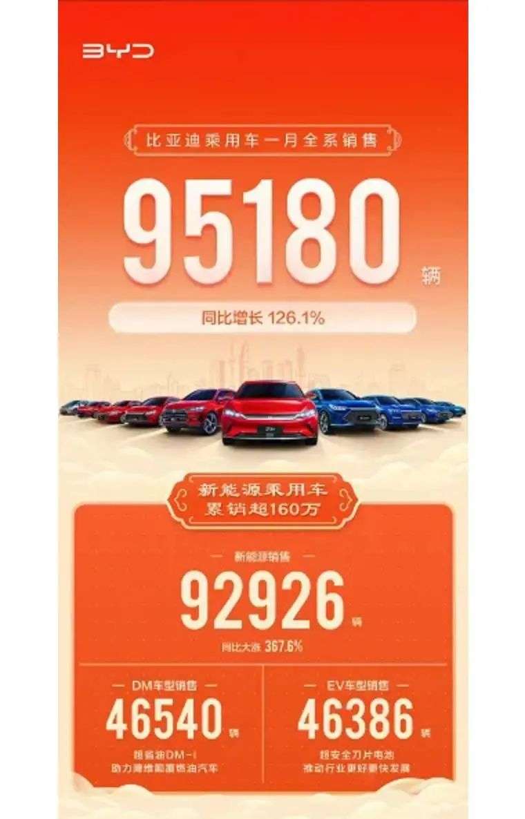 毫无疑问,早早就以新能源为发展方向的比亚迪目前是为数不多完成了电气化转型的传统车企。此前,比亚迪发布了1月的产销数据,比亚迪乘用车1月全系销售95180辆,同比增长126.1%,其中新能源乘用车销售92926辆,同比增长367.6%,占品牌总销量的占比超过98%,可以说经过多年的转型,比亚迪实质上已经是一个新能源车企。