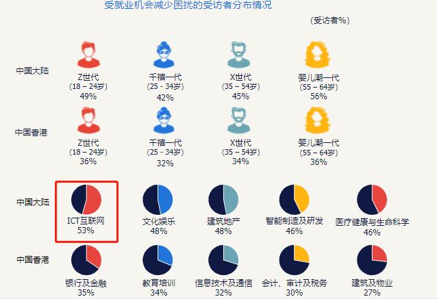 据《2022任仕达大中华雇员期望调研报告》显示,内外环境交织,职场人士深陷职场困扰:就业机会减少、职业前景不明、工作压力负荷、就业歧视等。其中, ICT互联网行业中,53%的大陆受访者面临着就业机会减少的困扰。与行业迭代快速,企业内部频繁动荡相关。