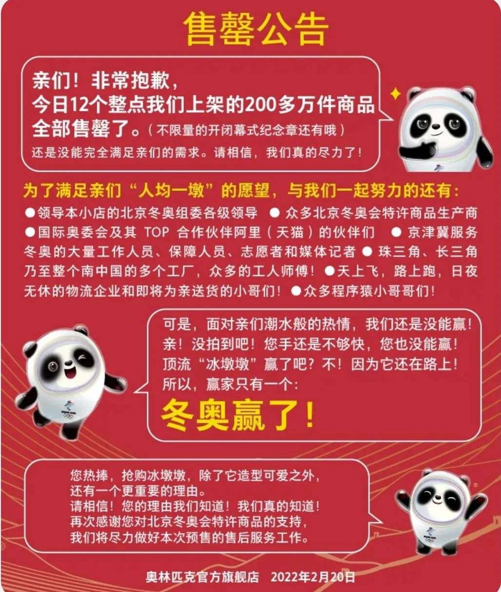 何况现在的年轻人已经具备为形象付费的意愿,此类IP的运营道路也已经被熊本熊,以及Line friend、迪士尼旗下角色印证。无论线上线下,交换徽章成为了新兴的社交方式。目前,天猫奥林匹克官方旗舰店仍有不少新品正处于预售阶段,不过2月20号冬奥会闭幕式当天店铺上架的200多万件商品,已经全部售罄。