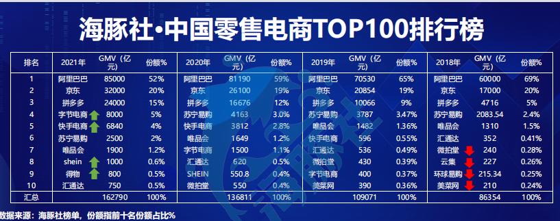 根据海豚社的数据,2021年,抖音电商的市场份额已经占到5%,仅次于阿里、京东和拼多多三巨头。从400亿元的GMV到8000亿元,字节跳动只花了三年。而快手电商的GMV也从2019年的596亿元扩张到2021年的6840亿元,市场份额也达到4%。