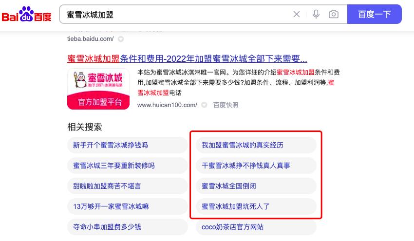 评论区清一色的吐槽令人咂舌,而“干蜜雪冰城不挣钱真人真事”、“蜜雪冰城加盟坑死人了”、“我很后悔加盟了蜜雪冰城”等词条在“相关搜索”一栏悄然展示也侧面印证了被百度“藏”起来的资讯才是蜜雪冰城加盟的“真相”。