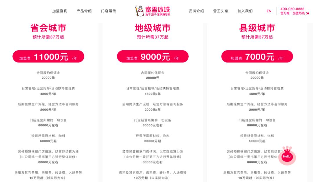 蜜雪冰城官网显示,县级城市、地级城市、省会城市每年加盟费分别为7000元、9000元和11000元,除了加盟费外,开店还有合同履约保证金、品牌管理费、门店开设所需要的设备等其他费用。粗略计算,加盟一家地级市蜜雪冰城前期投入费用大概在40万左右。