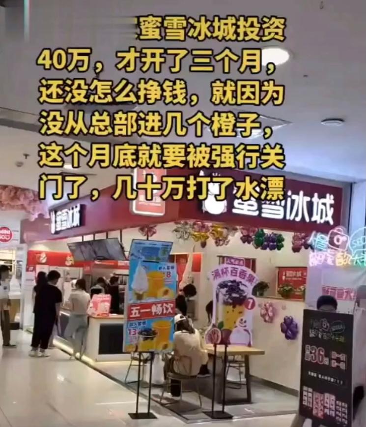 “投资蜜雪冰城40万,才开了三个月,还没怎么挣钱,就因为没从总部进几个橙子,被强行关门,几十万打了水漂。”一位加盟商在社交平台上表示,不愿从总部进原材料与其性价比不高有关,可一旦加盟商违反规定,轻则罚钱,重则取消加盟资格。