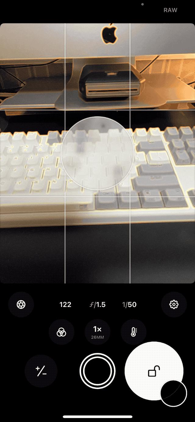 点击 ISO 和快门速度的数字,就可以直接通过一个轮盘来调节参数,而点击取景器中的任意位置就可以恢复为自动模式。在通过滑动轮盘来调节 ISO 和快门速度时,Haptic Engine 也会提供相应的震动反馈,不过感知度没有调节对焦和曝光时那么强。