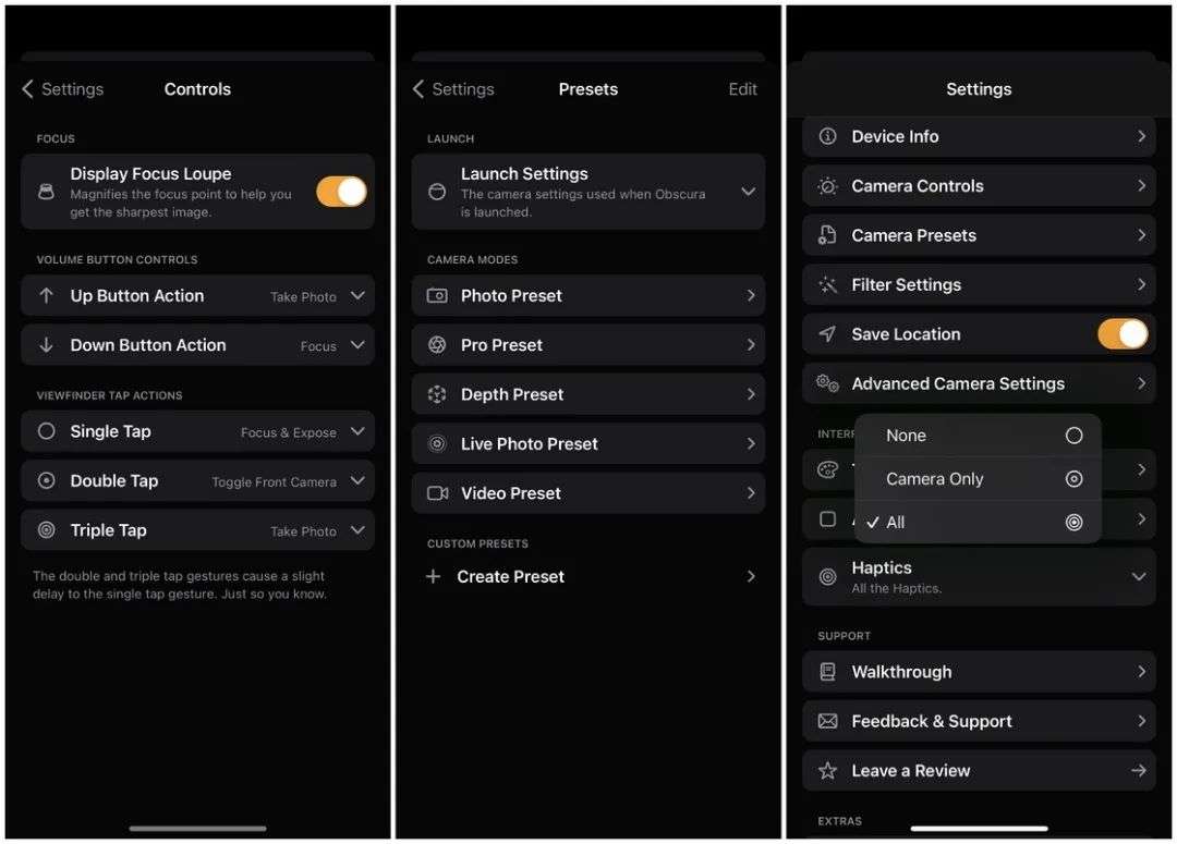 Obscura 在设置中也提供了很多个性化的自定义选项,比如说音量上下键、取景器都可以设置为不同的动作效果,每一个拍摄模式都可以提前做好各个参数的预设,连 Haptic Engine 的震动效果都可以指定生效的对象。
