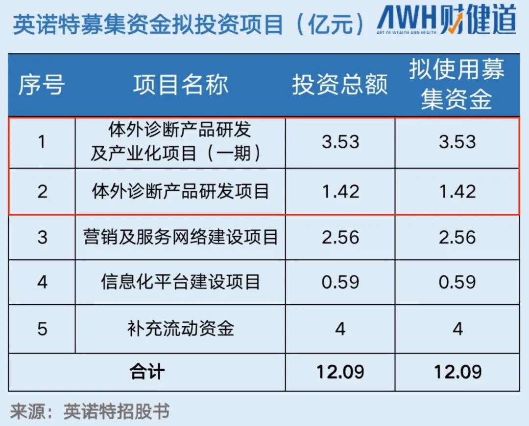 本轮上市拟募资金额为12.09亿元,其中体外诊断产品研发和产业化项目投资金额达4.95亿,占总投资金额的41%,其他营销、服务网络建设、信息化平台共3.1亿,占总投资金额的26%。