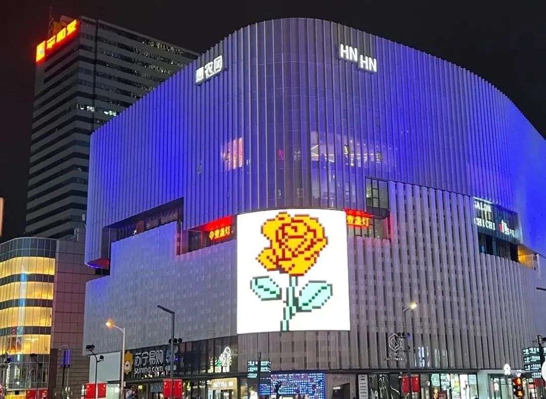 就在这家商场对面的另一家商场,他们在情人节当天也做了一个方案,在外墙大屏幕上打出了一朵数字玫瑰花。