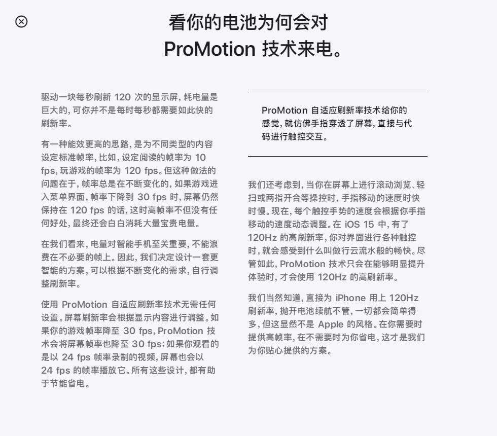 苹果在官网将其解释为:iPhone通过ProMotion 技木,可以让用户的内容帧率与屏幕刷新帧率保持一致。