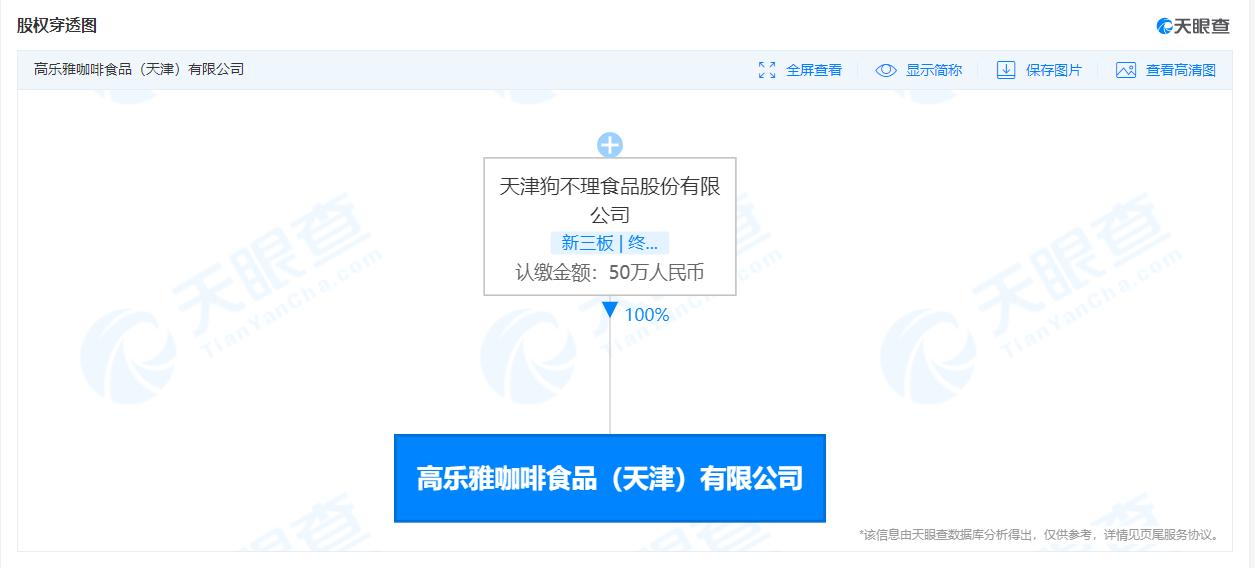 36氪获悉,天眼查App显示,2月22日,高乐雅咖啡食品(天津)有限公司成立,法定代表人张彦森,注册资本50万人民币,经营范围含食品销售;日用百货销售;餐饮管理等。股东信息显示,该公司由天津狗不理食品股份有限公司全资控股。