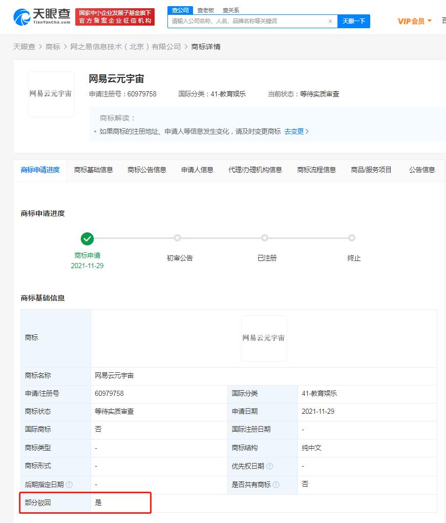 36氪获悉,天眼查App显示,近日,网之易信息技术(北京)有限公司申请注册的多个“网易云元宇宙”商标,状态流程变更为“驳回通知发文”,国际分类包括教育娱乐、科学仪器,这些商标均申请于2021年11月。值得一提的是,此前该公司申请的“网易元宇宙”商标也已被驳回。