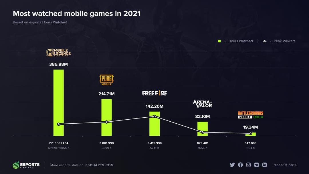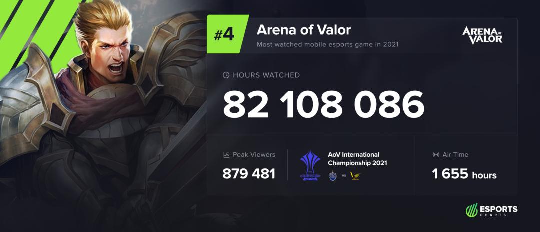 2021年手游产品衍生赛事的总观看时长榜单里,《MLBB》为3.86亿小时位居第一,《AOV》以8210万小时位居第四。《LOL:WR》未进入榜单。