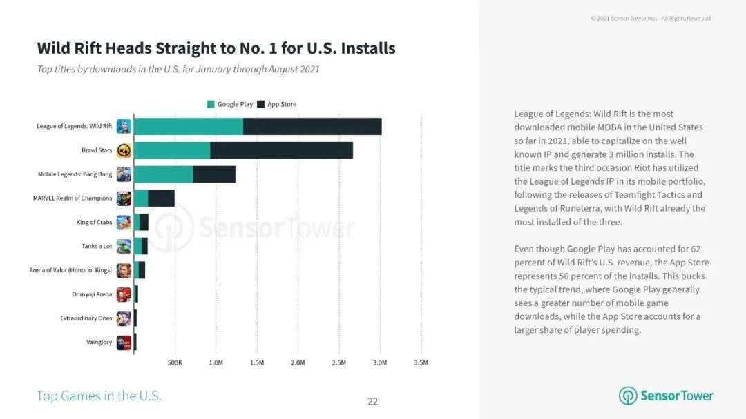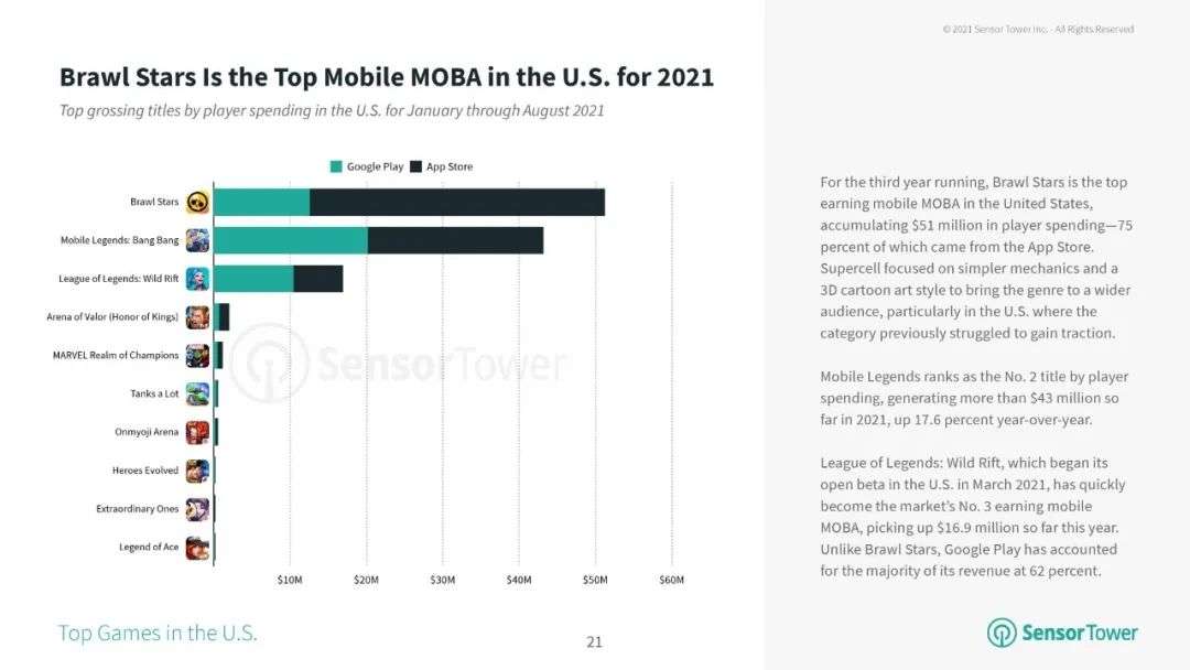 SensorTower的2021MOBA手游报告中,收录了几款全球MOBA游戏的IOS+GooglePlay渠道数据。