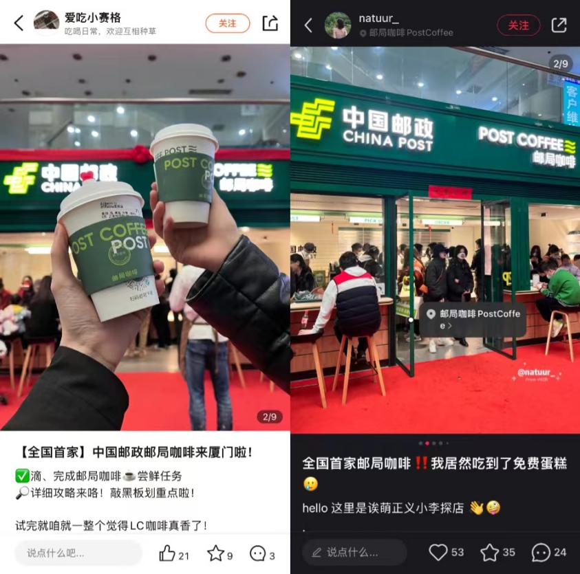但实际上,虽然官方号称是第一家邮局咖啡馆,中国邮政的咖啡店一直以来在互联网上就有迹可循。打开小红书这类的点评、攻略网站,早在2021年,上海、杭州、中山包括厦门当地,多地都有与中国邮政相关的咖啡店,或是独立店面,或是报刊亭。邮局与咖啡的组合是许多文艺青年向往的搭配,而可能正是看到了这样的市场潜力,中国邮政也下定决心跨界。
