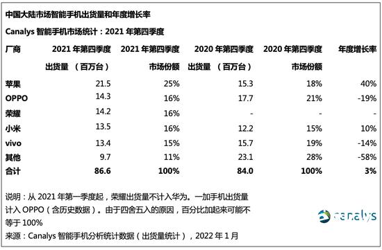 中国市场的强劲需求正成为苹果业绩高速增长的助推器。市场调研机构Canalys发布的数据显示,2021年四季度,iPhone在中国市场出货2150万部,同比增长40%,市场份额达到25%。苹果时隔六年再次成为中国市场单季度第一。