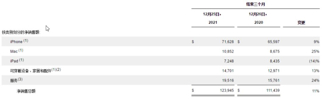 硬件方面,iPhone业务实现营收716.3亿美元,同比增长9%;Mac产品实现营收108.5亿美元,同比增长25%;可穿戴设备、居家等其他产品实现营收147.0亿美元,同比增长13%;iPad实现营收72.5亿美元,同比下降14%,成为本季度苹果细分业务中唯一同比下滑的品类。