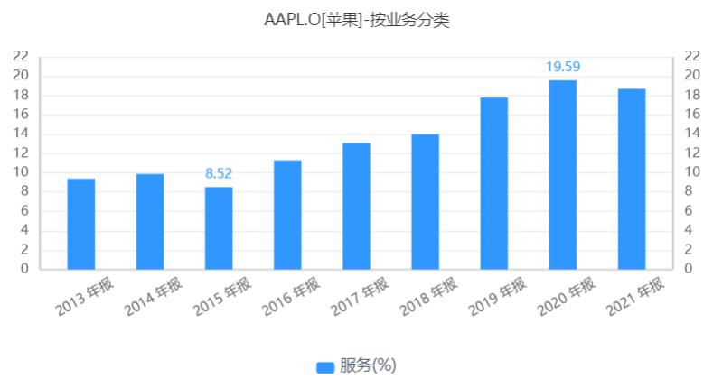 但对于苹果来说,20%似乎已成为其服务收入占比的一个“天花板”。通过上图可以看出,2021财年,苹果服务收入占比同比出现下滑,由19.59%下滑至18.7%。2022财年第一季度,这一占比数据下降至15.75%。