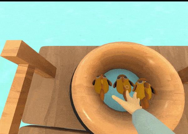 第二个小游戏,喂鱼。抓起小鱼往海面上仍,弹进鱼嘴里就得分。这个游戏一开始时,硅星人完全是一脸懵,不知道要拿面前的这些小鱼干嘛,直接向远处的鲨鱼扔去也没用。后来才发现,你得让那个鱼饵在海面上反弹一下进入鲨鱼嘴里才算分。